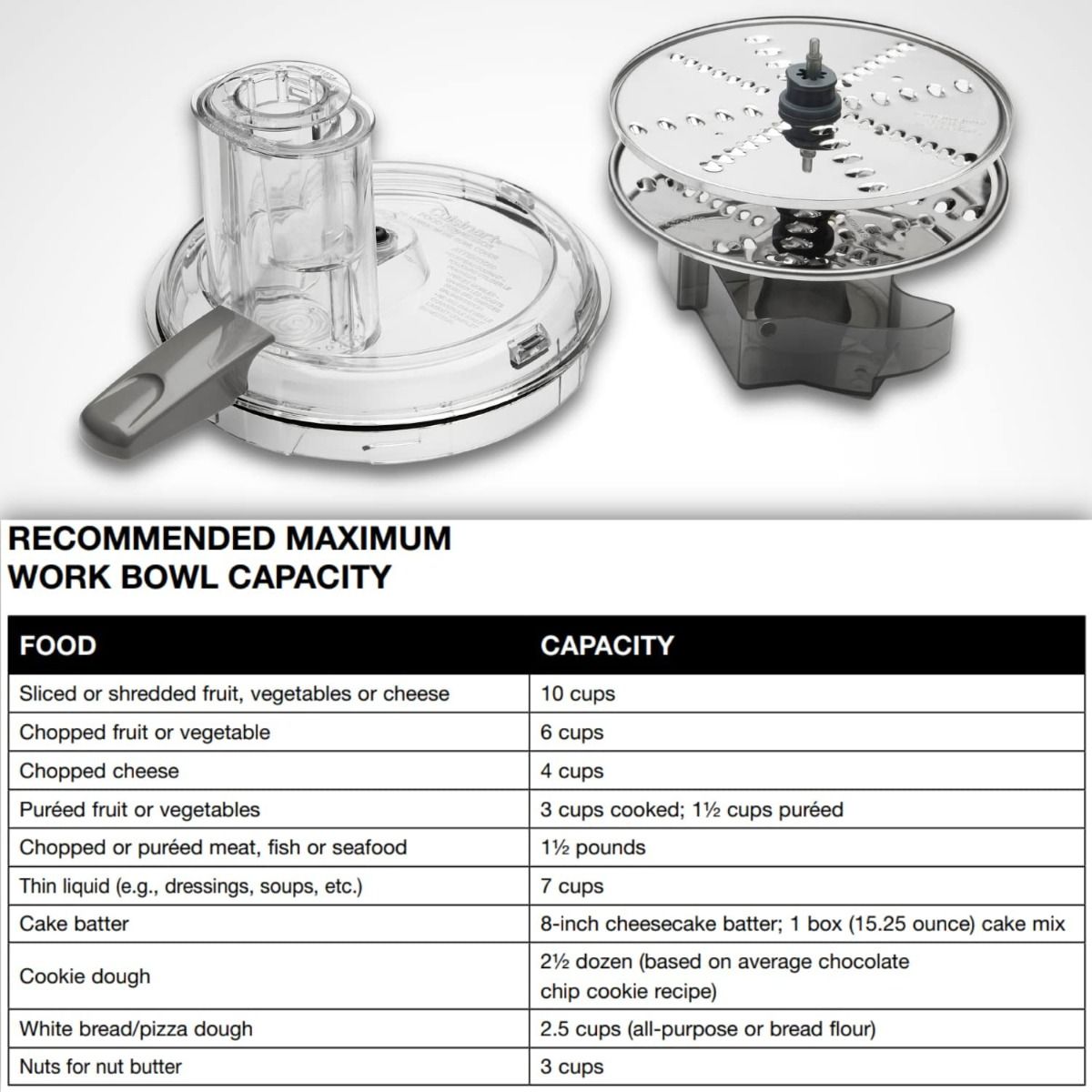 - Handles 10 cups of sliced or shredded food, 6 cups of chopped food, or 2.5 cups of dough