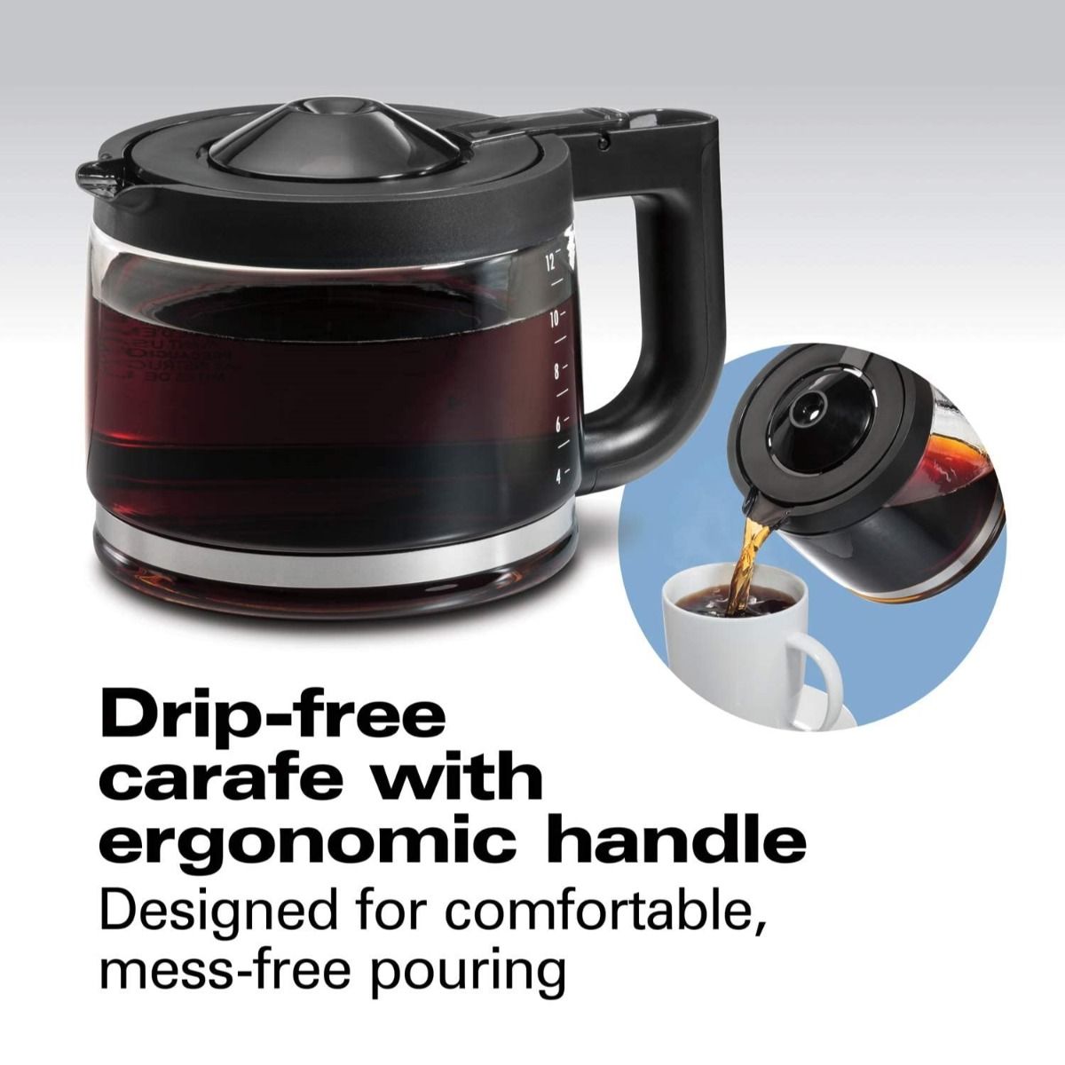 - The drip-free carafe has an ergonomic handle for easy pouring